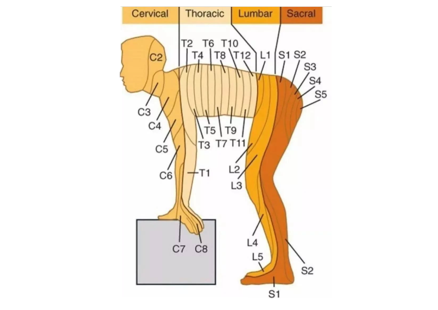 Each dermatome corresponds to a specific spinal nerve root, and the map illustrates how these nerves distribute sensory information across the surface of the body. Clinicians use this map to interpret sensory symptoms such as pain, numbness, or tingling in a way that helps identify underlying nerve issues.